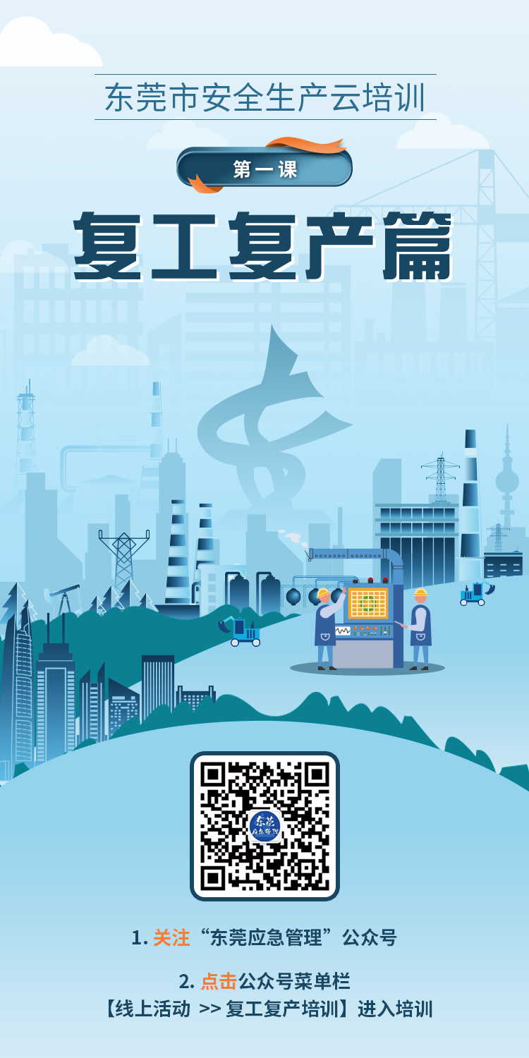 參與指南:關(guān)注“東莞應(yīng)急管理”公眾號(hào),通過(guò)點(diǎn)擊公眾號(hào)菜單欄【線(xiàn)上活動(dòng)→復(fù)工復(fù)產(chǎn)培訓(xùn)】,登記個(gè)人信息,完成注冊(cè)后,點(diǎn)擊“我要參加”進(jìn)入培訓(xùn)內(nèi)容界面,點(diǎn)擊觀看視頻進(jìn)行學(xué)習(xí)。